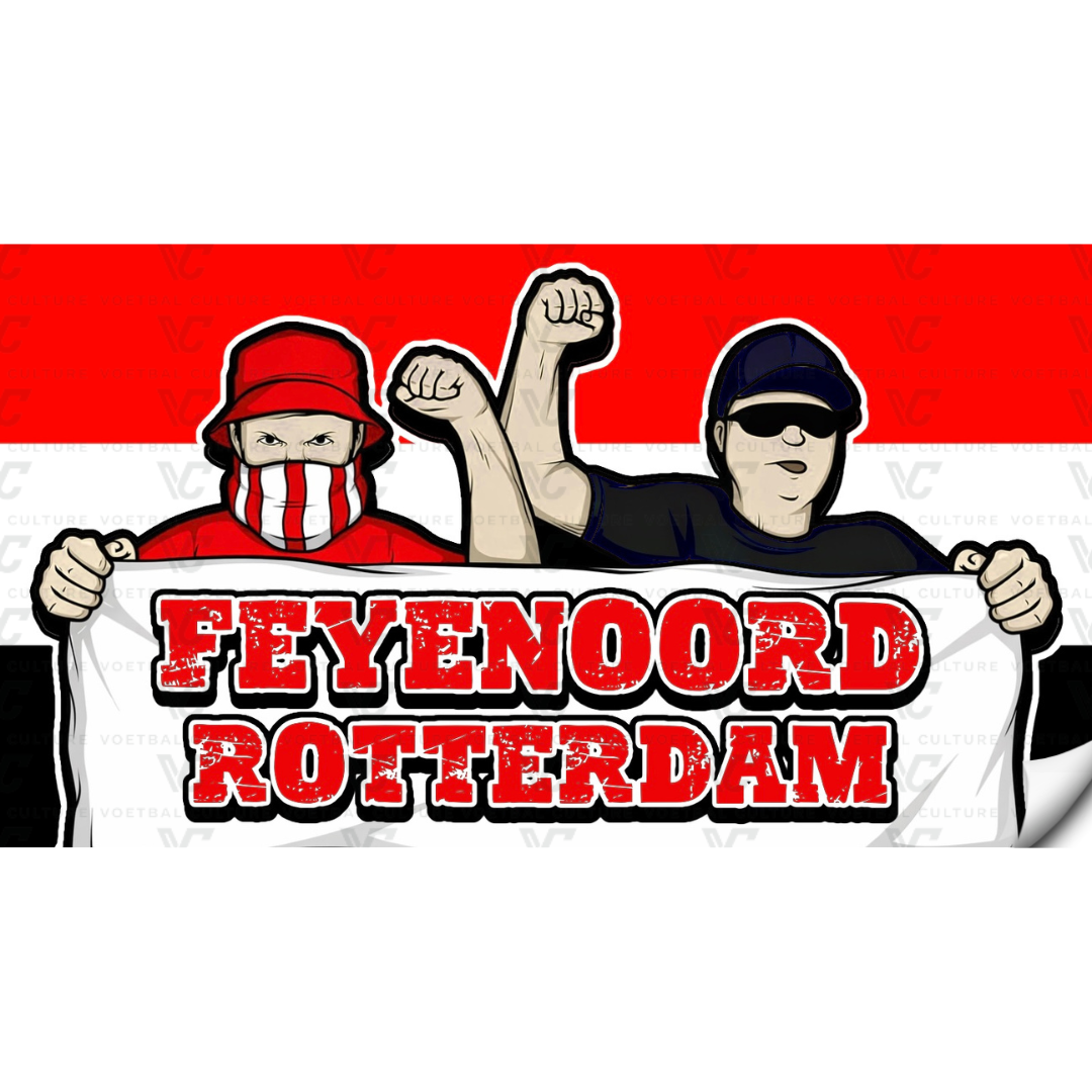 Deze ‘Feyenoord Rotterdam’ sticker (9×5 cm) straalt pure clubtrots en supportersmentaliteit uit. Het design toont twee fanatieke supporters die een banner vasthouden met de naam van de club, wat direct de sfeer van het stadion en de fanbase weergeeft.